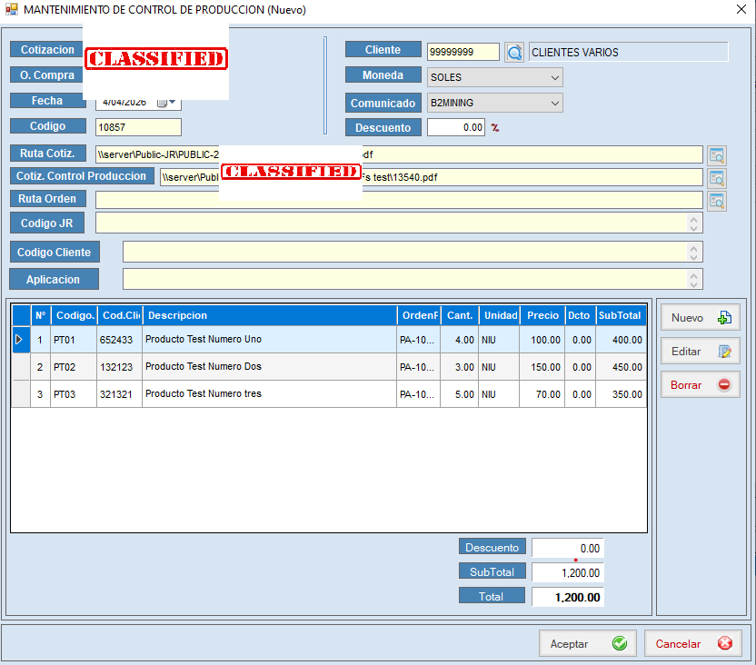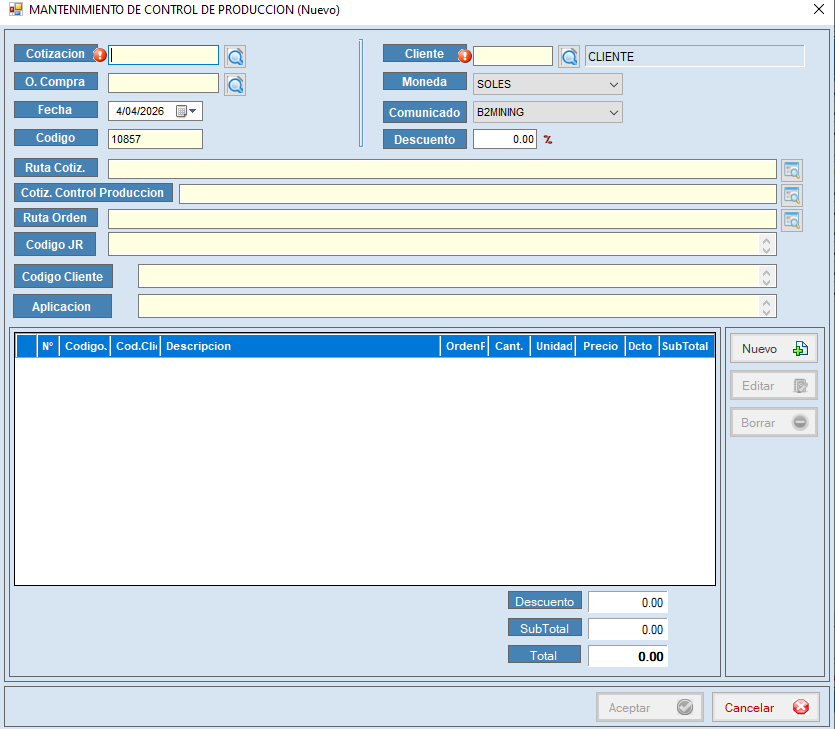 Para generar un documento de control de producción , nos dirigimos al botón de nuevo, para que se nos abra un formulario.